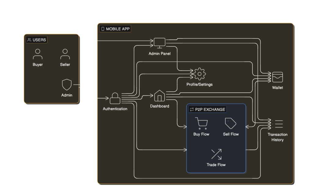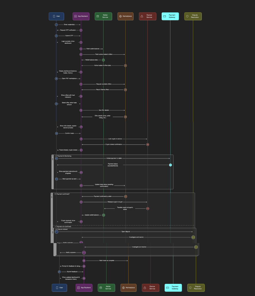 I began by mapping the full end-to-end P2P trading journey, from onboarding to trade completion and dispute resolution. This helped identify friction points and moments of uncertainty where users were most likely to abandon the process.
